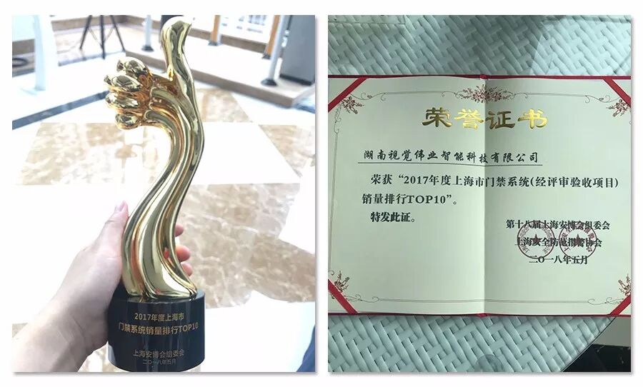 基于视觉伟业&乐泊的技术优势,在本次安博会上,上海安全防范报警协会为视觉伟业颁布了“2017年度上海市门禁系统(经评审验收项目)销量排行TOP10”的荣誉证书以及奖杯,认可了视觉伟业&乐泊在人脸门禁方面做出成绩。