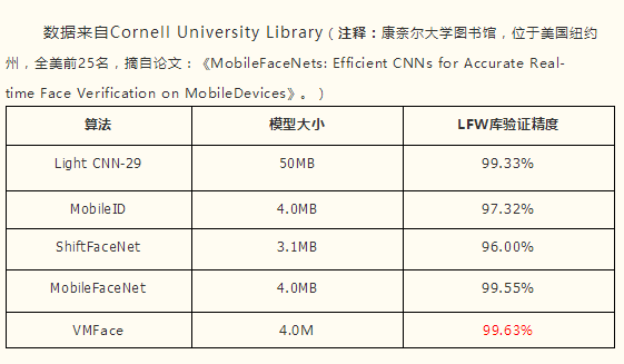 视觉伟业&乐泊的技术团队来自于全球前沿的计算机视觉技术研究机构,具有超过20年的计算机视觉研究和应用经验。2018年5月,LFW库(Labeled Faces in the Wild,国际权威人脸识别测算集)公布了最新的测试结果,在应用于移动终端和嵌入式设备的人脸识别算法中,视觉伟业VMFace算法位列LFW首位!相较于第二位的Mobile FaceNet,误识别率降低了18%。